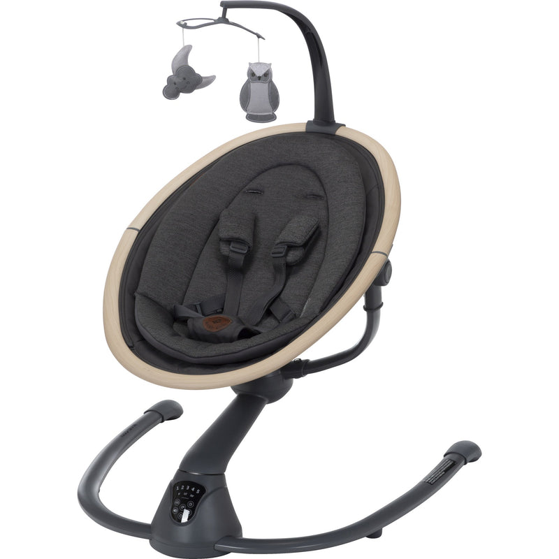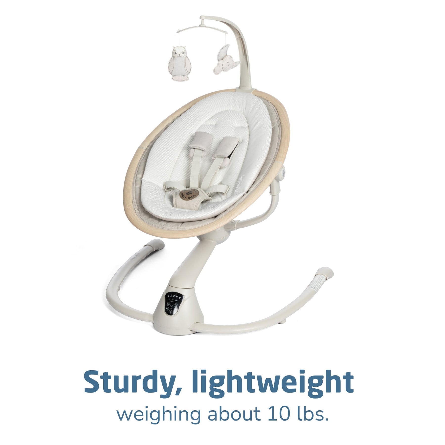 This Maxi Cosi swing is a stylish and smart swing for babies from birth to 20 pounds. The Cassia instinctively knows when and how to rock your baby thanks to the automatic motion detector. The Cassia simply activates the swing when it recognizes your baby needs comfort. Its 360º rotation helps you maintain eye contact with your baby. Not only does it weigh about 10 pounds, it also has a space-saving frame. Its luxurious finishing and high-quality fabrics ensure the design matches any interior, and comes with an easy to remove, machine-washable cover. Cassia comes with two toys to give your baby something to look at, two recline positions and a soft and cozy newborn inlay to provide your baby with the utmost comfort.