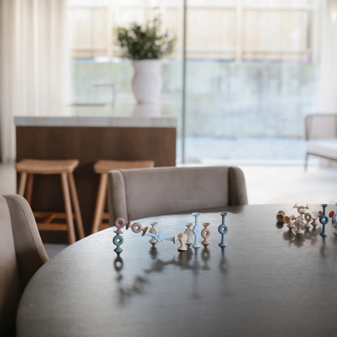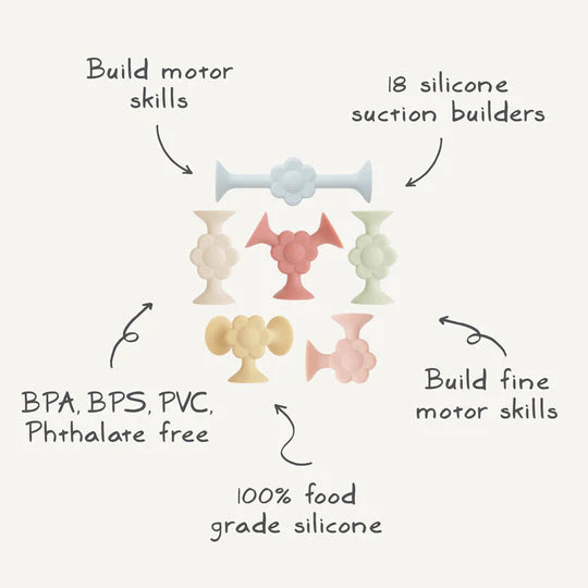 Encourage open ended and constructive bath play with the Mushie Suction Bath Builders. The set of 18 silicone pieces connects and sticks to smooth surfaces so kids can build towers stick shapes to the tub and explore spatial play while parents enjoy simple cleanup and compact storage.