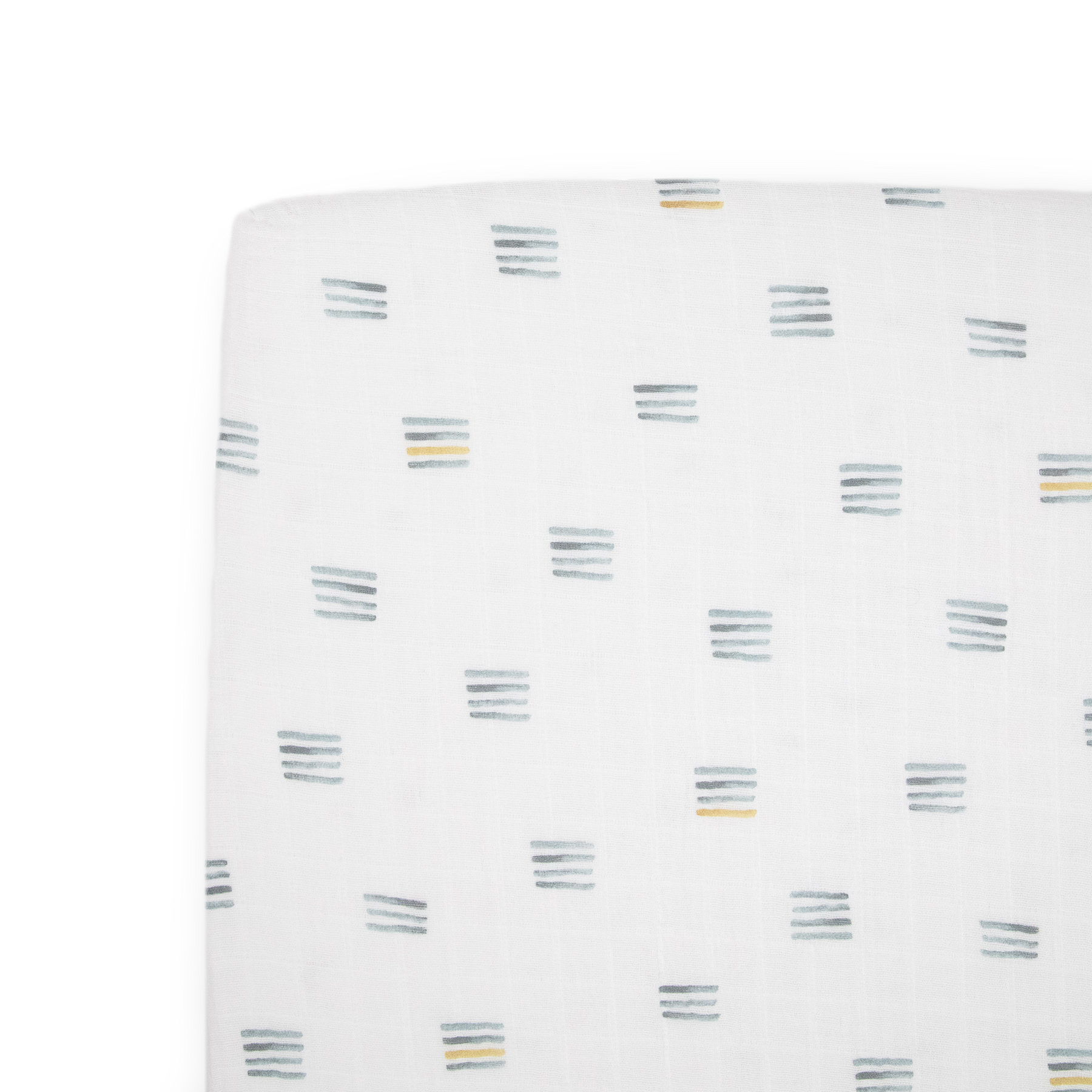 The Little Unicorn Cotton Muslin Crib Sheet - Blue Stacks combines comfort, style, and practicality, making it an essential for every nursery.