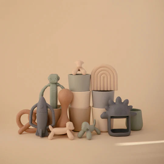 Soothe teething discomfort with the Mushie Dog Figurine Teether. The compact chewable shape is easy for tiny fingers to hold while textured silicone massages sore gums and supports fine motor grip development.