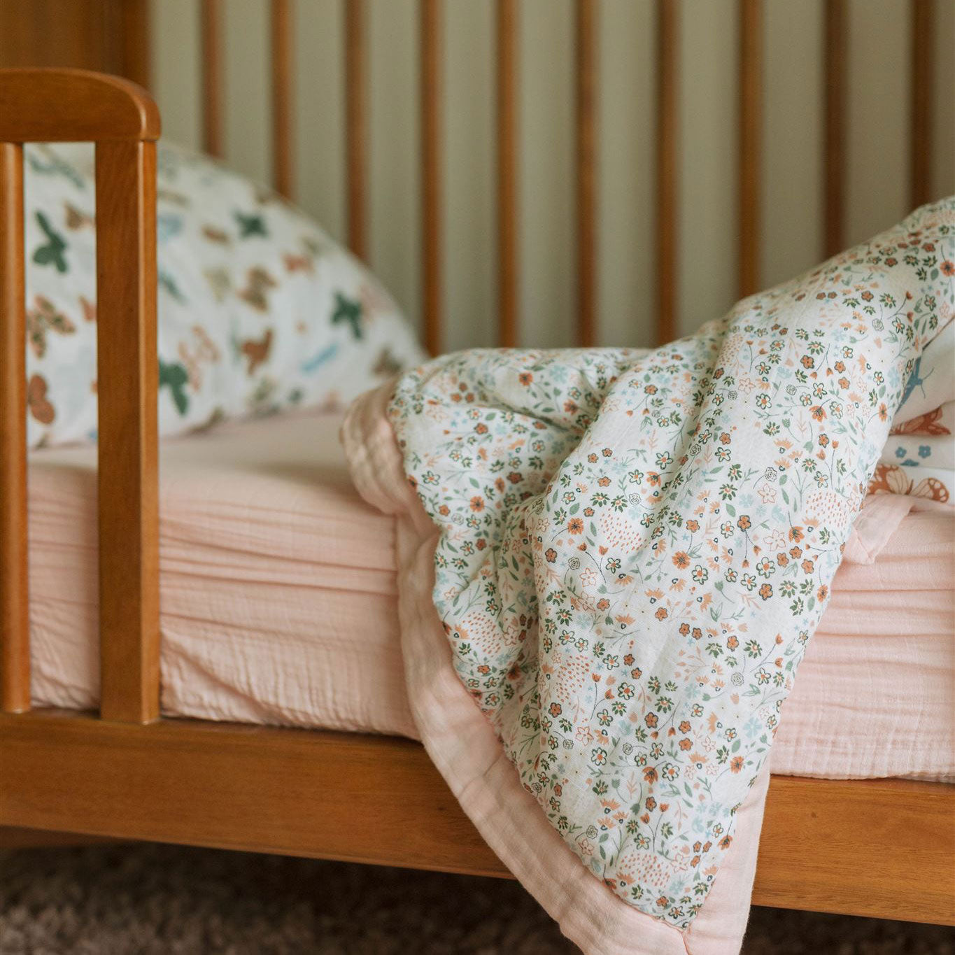 Crafted from premium 100% cotton muslin, this set is lightweight, breathable, and gentle on delicate skin. The four-layer muslin comforter provides just the right amount of warmth for year-round use, while the sheet and pillowcase feature a soft, airy weave that stays cool and cozy.