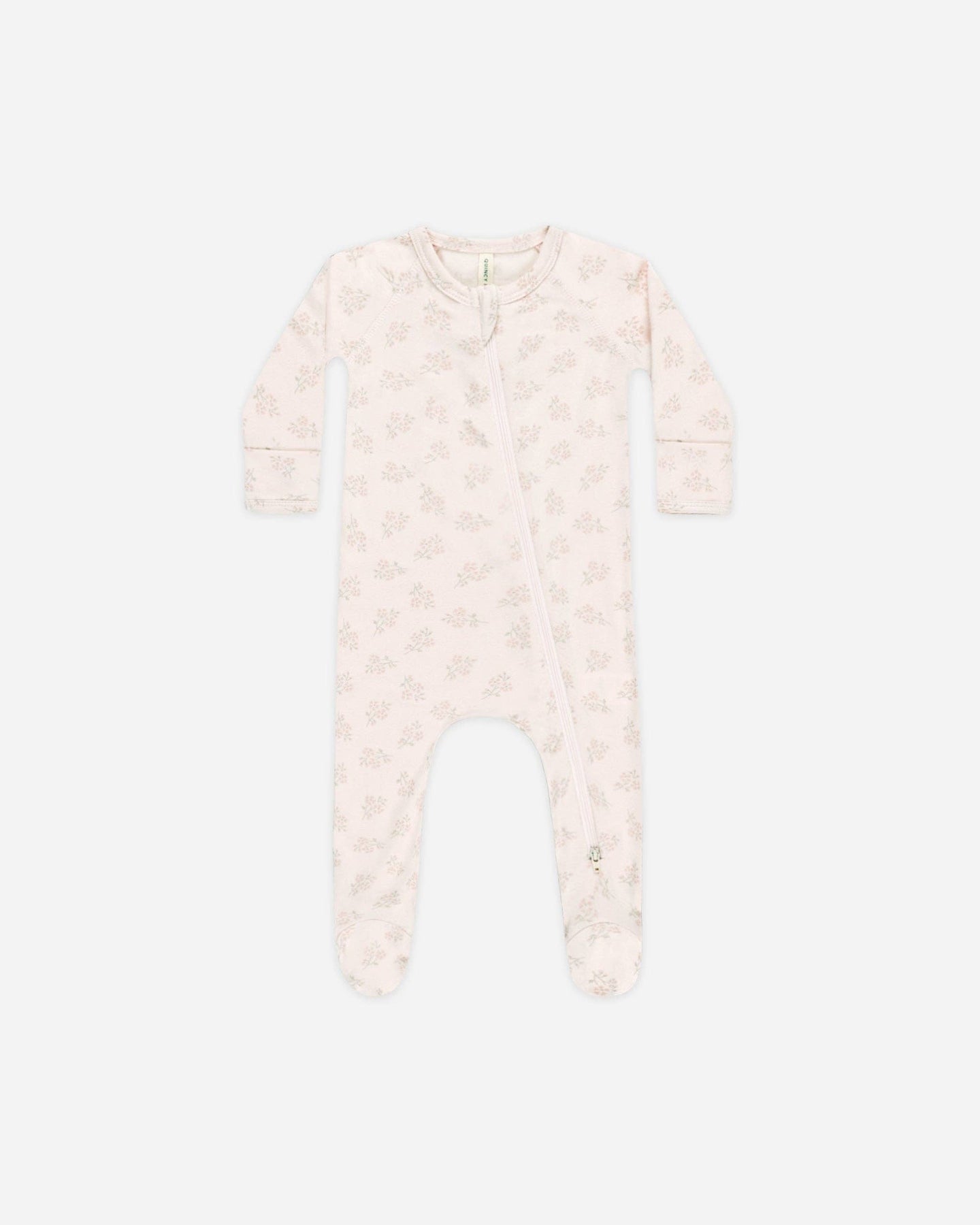 This cozy footie sleeper is designed for everyday comfort and easy changes. A two-way zipper makes diaper changes quick and simple, while fold-over mitts in smaller sizes help prevent scratches and keep little hands warm. For growing walkers, rubberized sole grips in larger sizes add extra stability. Finished in Quincy Mae’s soft pink blossom print on a gentle petal hue, it’s a sweet essential for day and night wear.