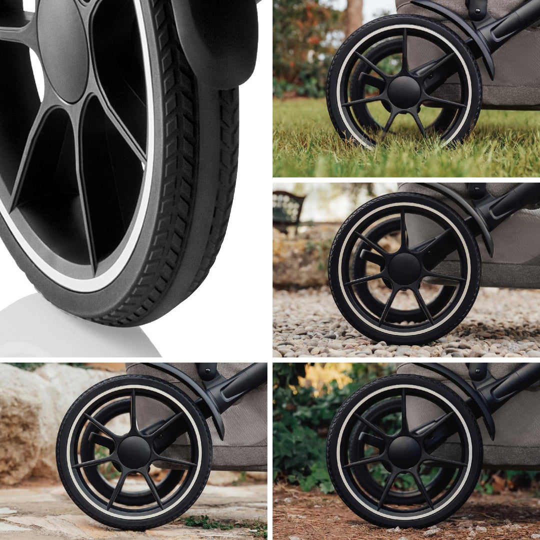 • Smooth Maneuverability: Swiveling front wheels, central suspension & all-terrain, puncture-free tires.