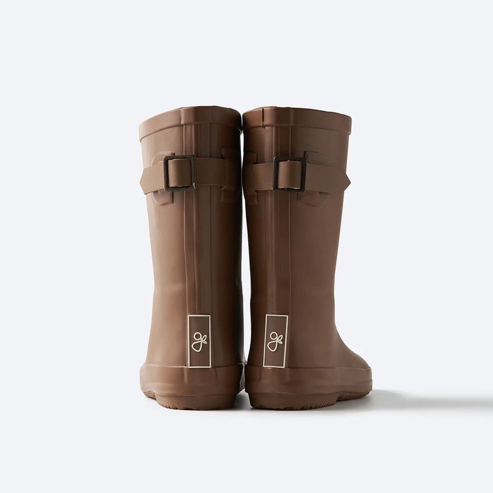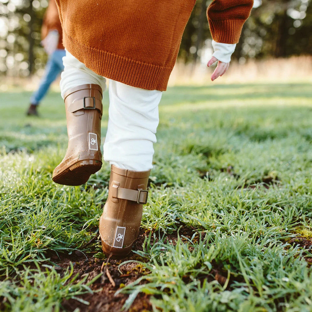 Goumikids Muddies are waterproof with a flat gripper sole to keep little feet dry and safe from all the puddle splashing! Printed Logo on front, decorative buckle on the back, with a rounded toe for growing room. Custom color with a matte finish on the outside and a soft cotton lining on the inside for a comfy fit!