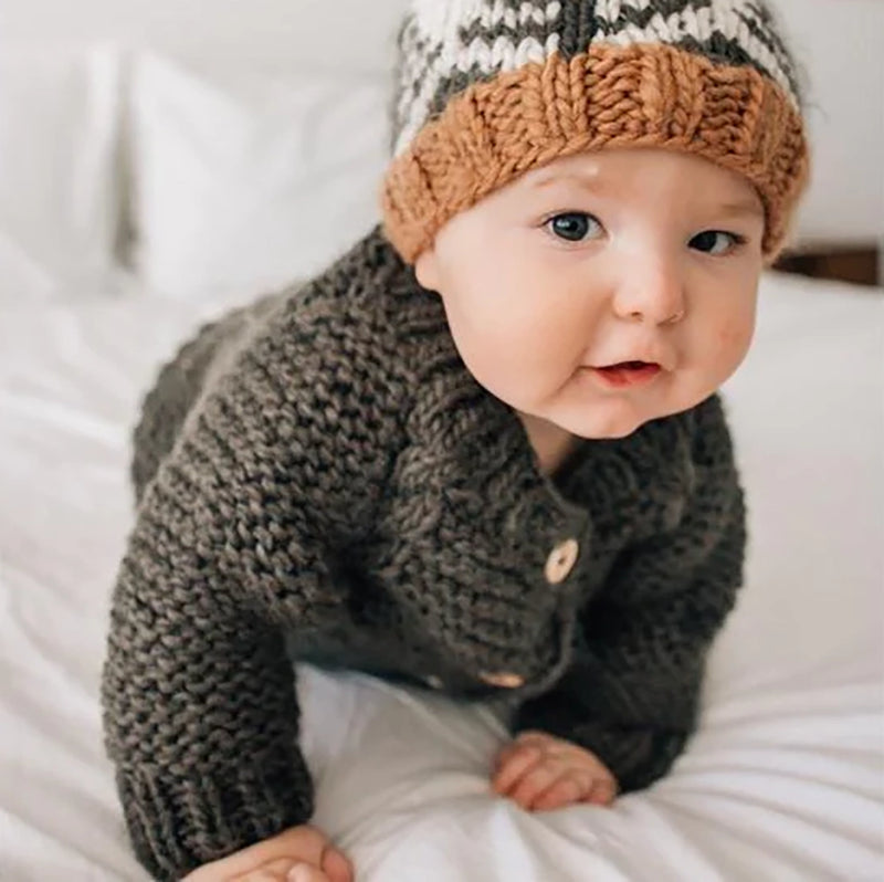 Keep your little cutie looking super fly in this fetching and cuddly cardigan from Huggalugs. Thick and oh-so-snuggly in garter stitch, with cable trim raglan sleeves and cute-as-can-be wooden buttons.