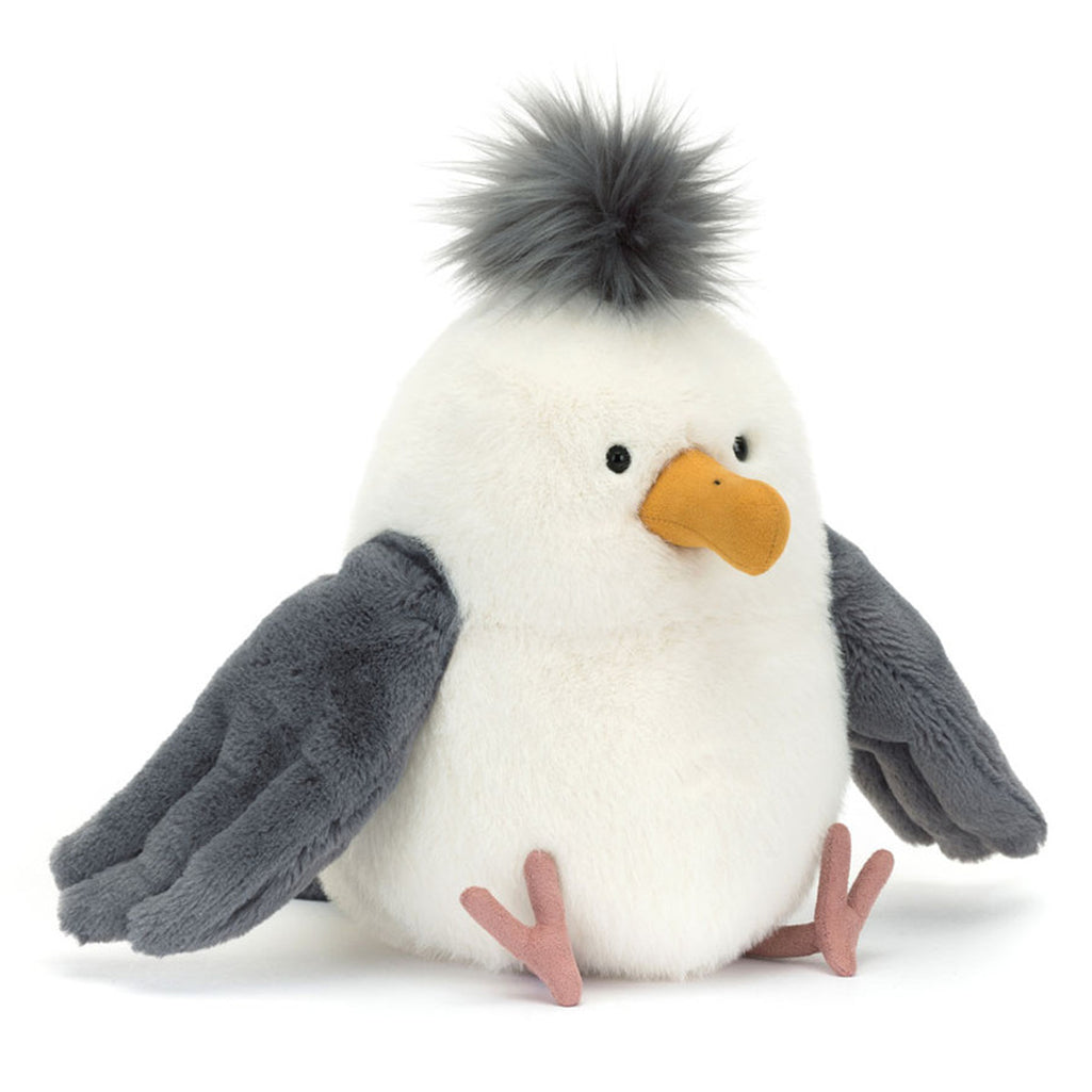Meet Chip Seagull, the top beach bird companion! Made of soft cream fur and dark grey wings, Chip also boasts thin suedette legs and a curved mustard beak. With a playful and fun design, this Jellycat stuffed animal is perfect for a sunny day at the beach.