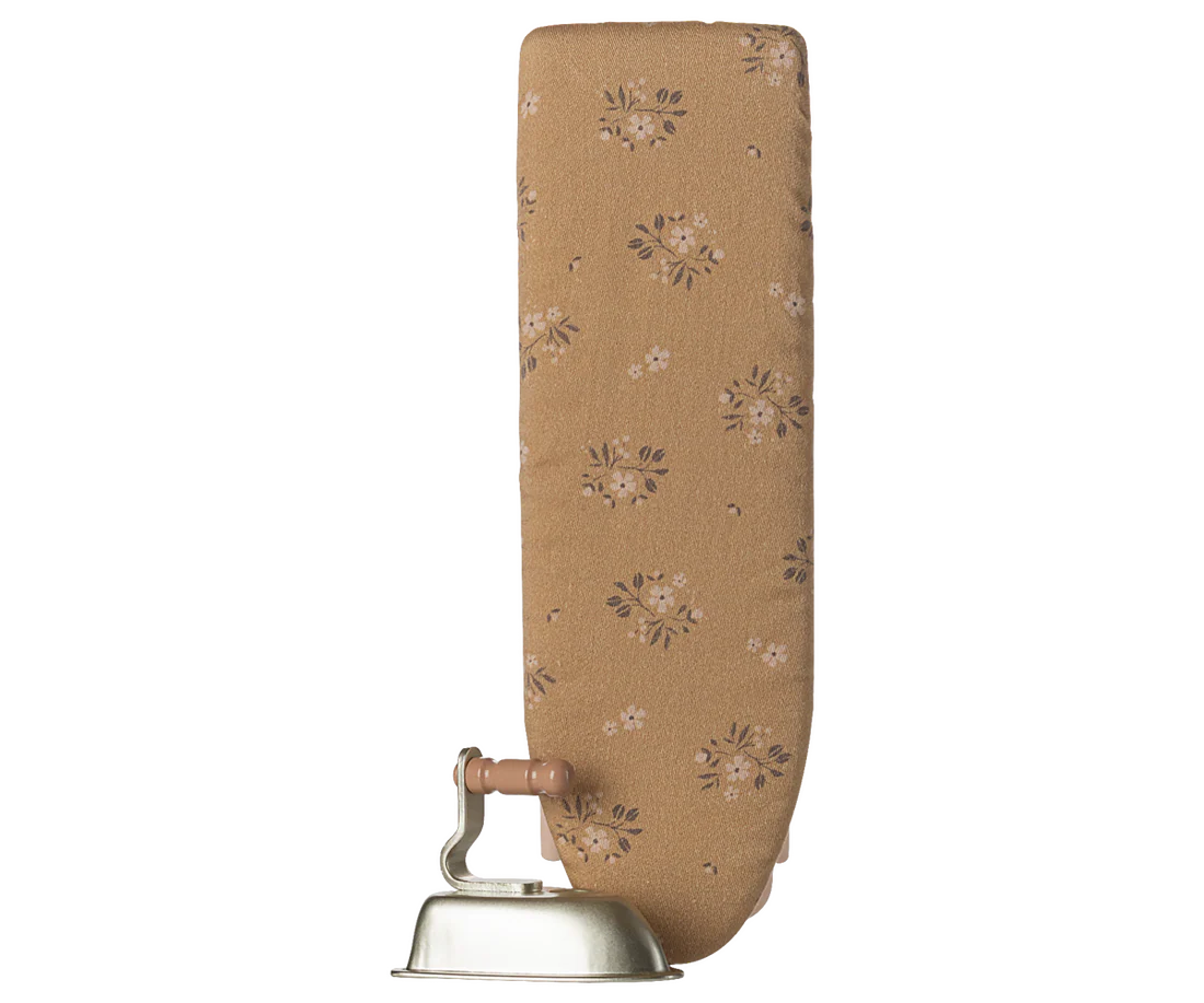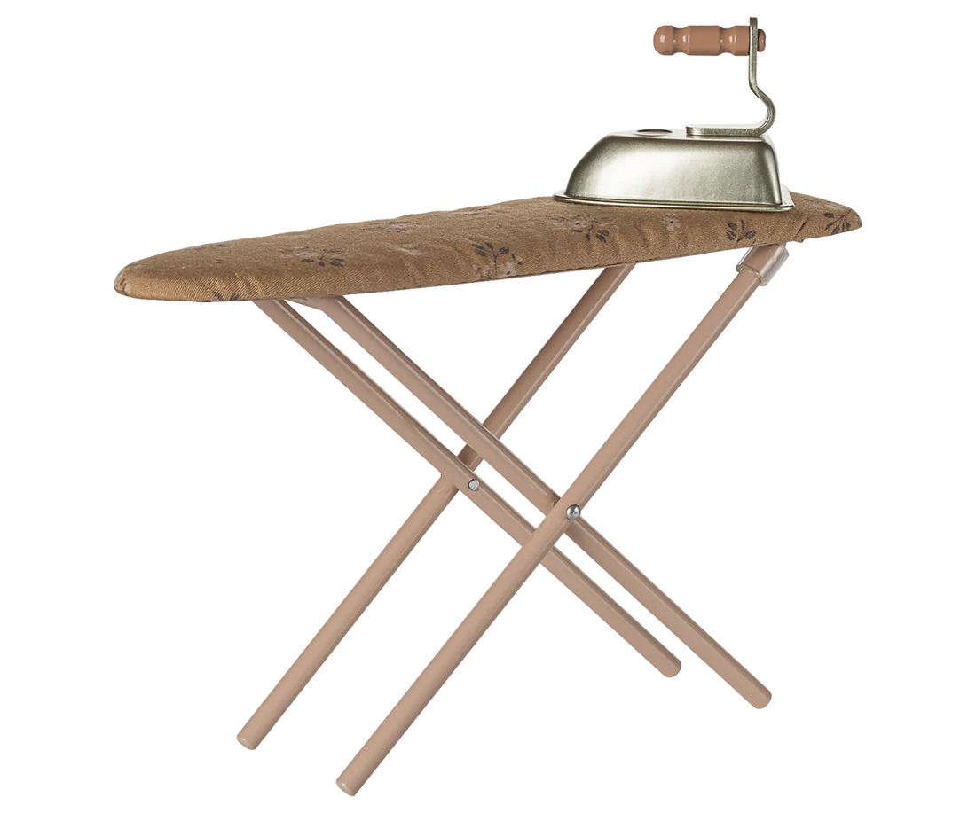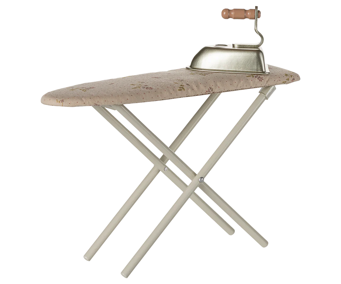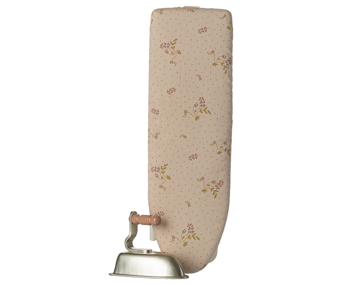 This delightful set features a miniature metal iron and a sturdy ironing board with fold-up metal legs for easy play and storage. The board is topped with a soft floral cotton fabric cover, adding a cozy, vintage-inspired touch. Perfectly sized for Maileg bunnies, rabbits, and the Teddy family, this accessory encourages role play and helps children create rich, engaging play scenes.