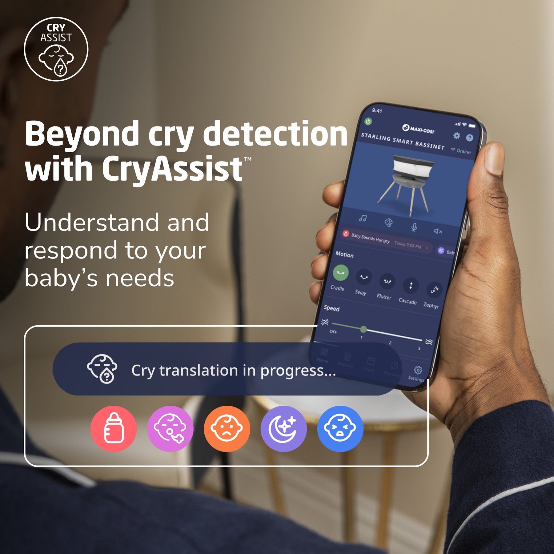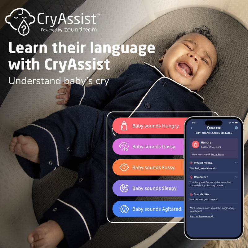 Powered by Zoundream, our groundbreaking CryAssist™ technology uses AI to translate your little one’s cries, letting you know if they might be sleepy, fussy, gassy, agitated, or hungry; and by knowing what is bothering your baby, you’ll be able to respond to their needs quickly and with confidence. Your little one is communicating with you, and with CryAssist, now you’ll know what they’re saying. Each of CryAssist’s response-based features are optional, ensuring control is always in your hands. With cries and cry data kept anonymous and encrypted on our cloud, private moments are kept between you and baby.