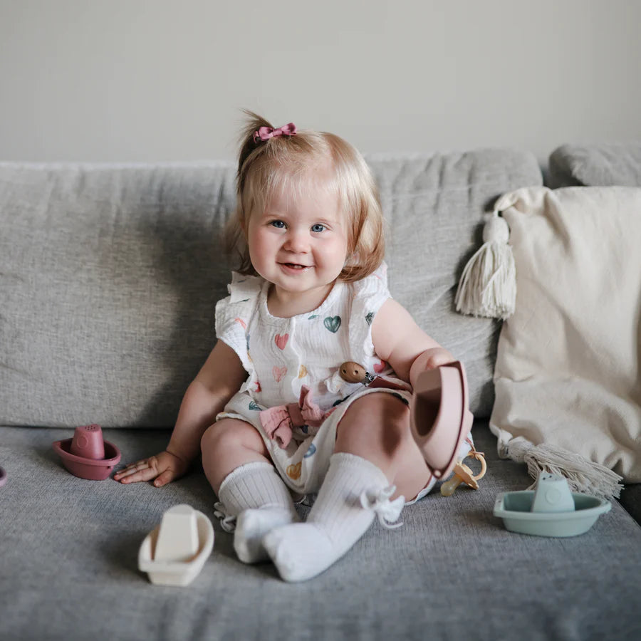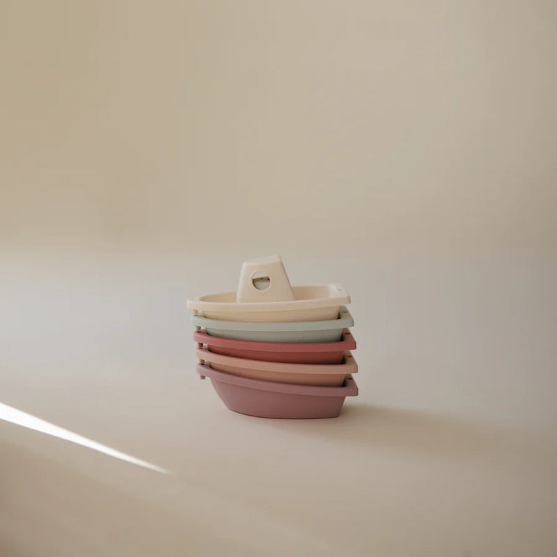Ignite your child's imagination with the Mushie set of five stackable bath toy boats! Designed for independent play these nautical classics from Denmark are perfect for children of all ages. Build a floating train of bath toys by linking the plastic boats together. Get ready for hours of fun and adventure in the tub!